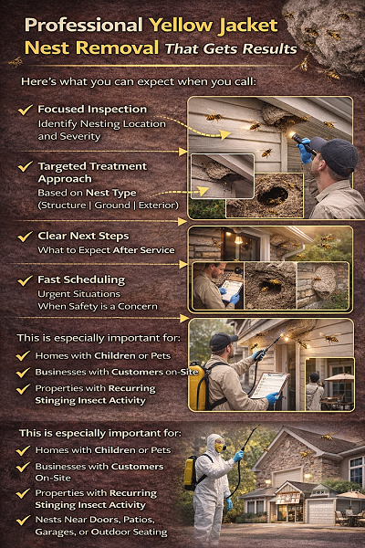 When yellow jackets show up, the risk isn’t just a painful sting — it’s how quickly an active nest can become dangerous for kids, pets, customers, and anyone using the property. Patriot Pest Control provides professional yellow jacket nest removal and stinging insect control across Jackson, Lansing, and nearby Michigan communities, with service designed to remove the threat fast and restore peace of mind.